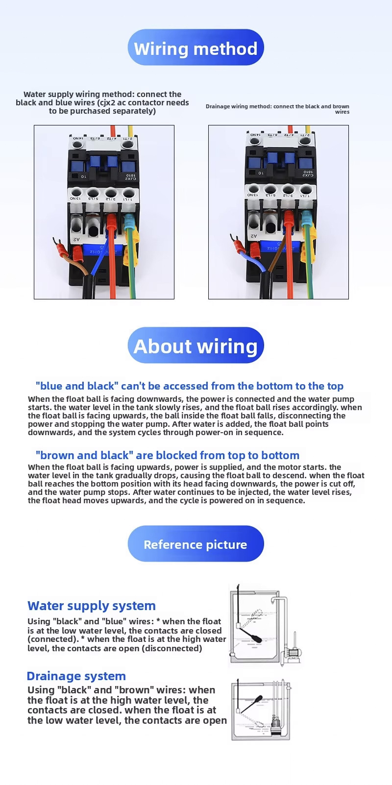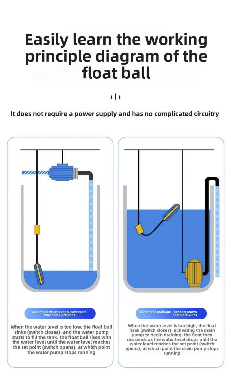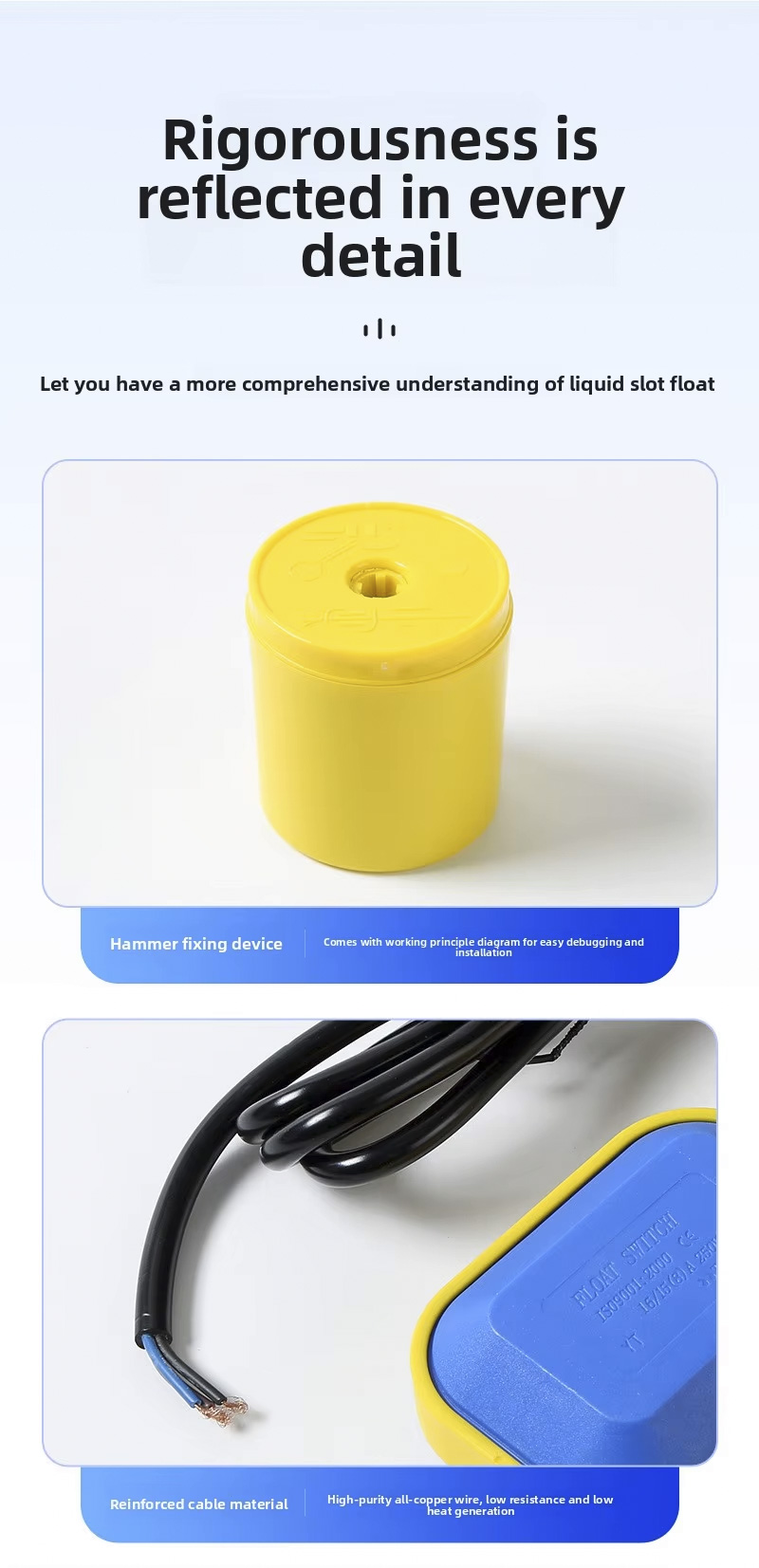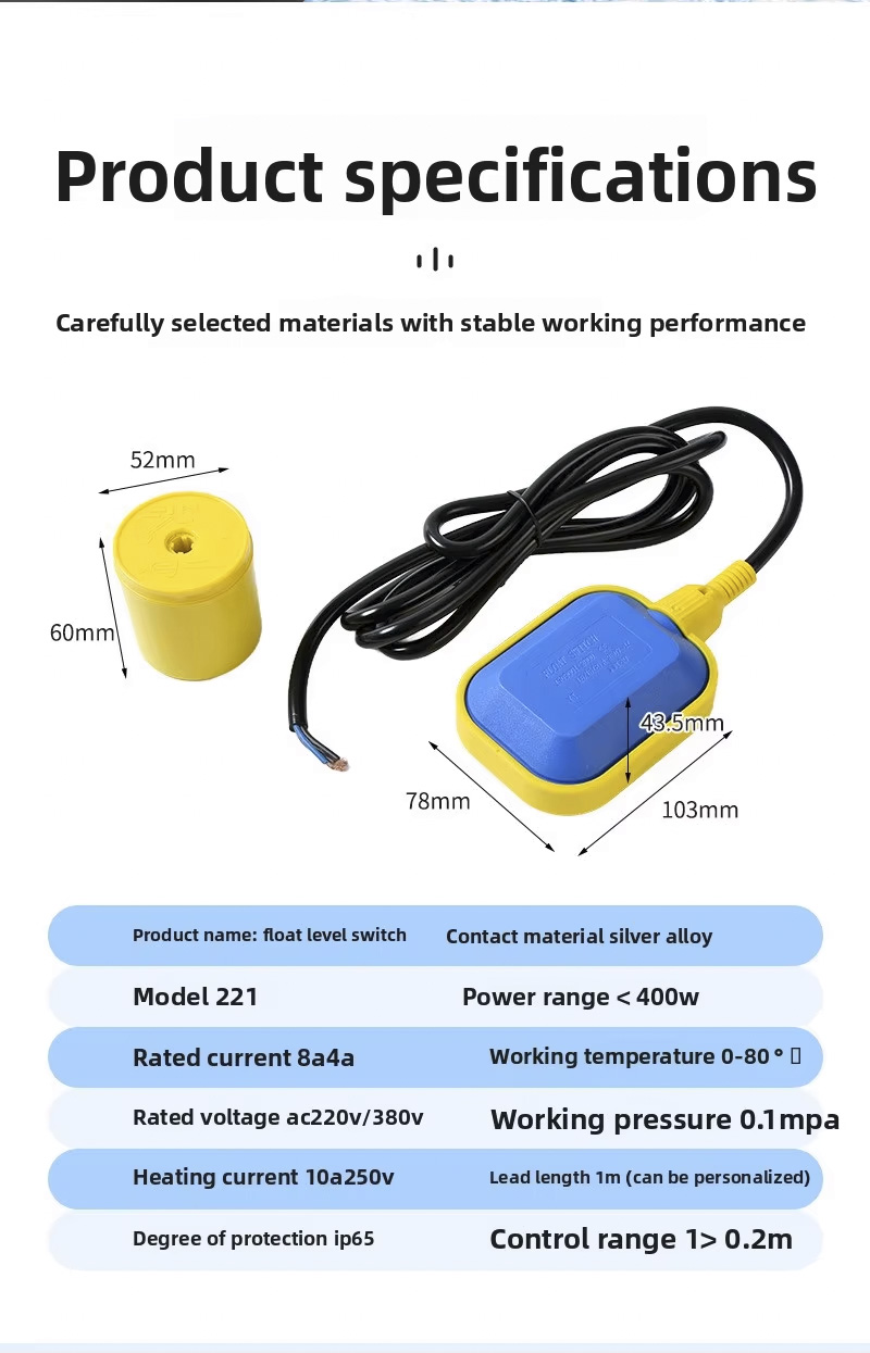 Cet interrupteur à flotteur présente une grande conception circulaire avec un indice de protection IP68 de 2 m, 3 m, 5 m, 10 m et fonctionne à des températures de 0 ℃ à 80 ℃. Il prend en charge une large plage de tension de 110 V à 220 V et a une pression de fonctionnement robuste de ± 0,5 MPa. Le produit est personnalisable avec une gravure laser, des logos en relief ou des services OEM/ODM, garantissant une adaptabilité à diverses applications.