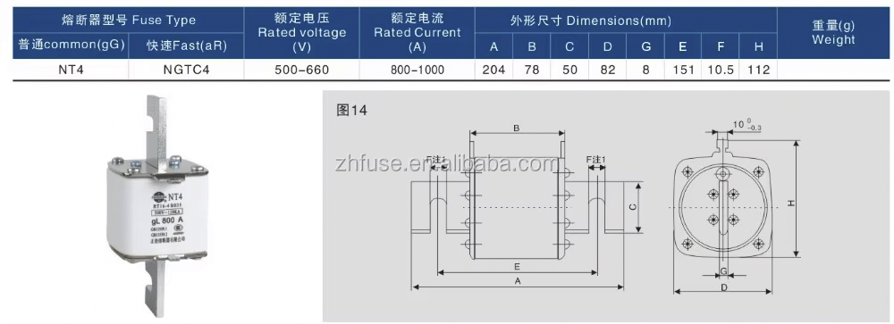 Ce fusible de série est principalement utilisé pour protéger le circuit électrique contre les surcharges et les courts-circuits (gG/gL). En raison des différentes pastilles de fusion, il peut également servir à protéger le dispositif semi-conducteur et d'autres ensembles complets contre les courts-circuits (aR/gR/gs/gtr) ainsi que le moteur électrique contre les courts-circuits (aM). Ils sont conformes à la norme nationale GB13539 et à la norme du comité électrique international IEC60269.