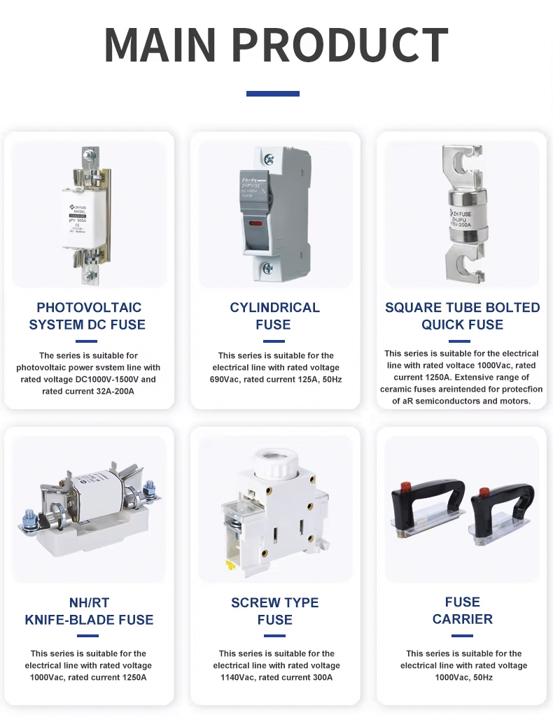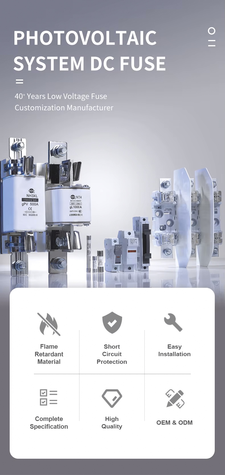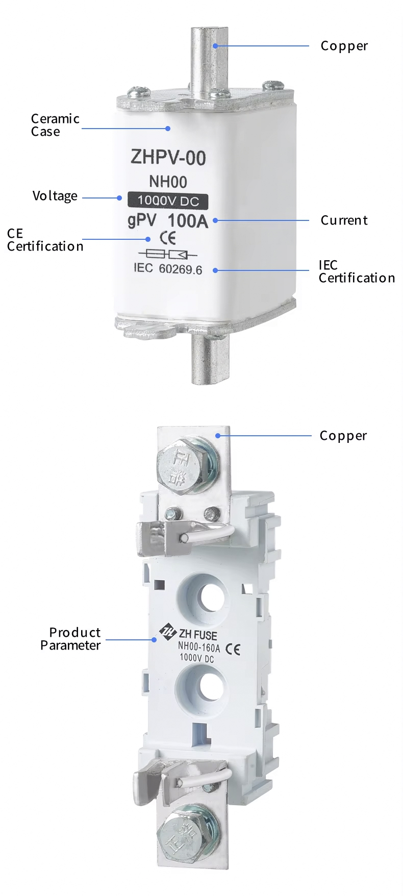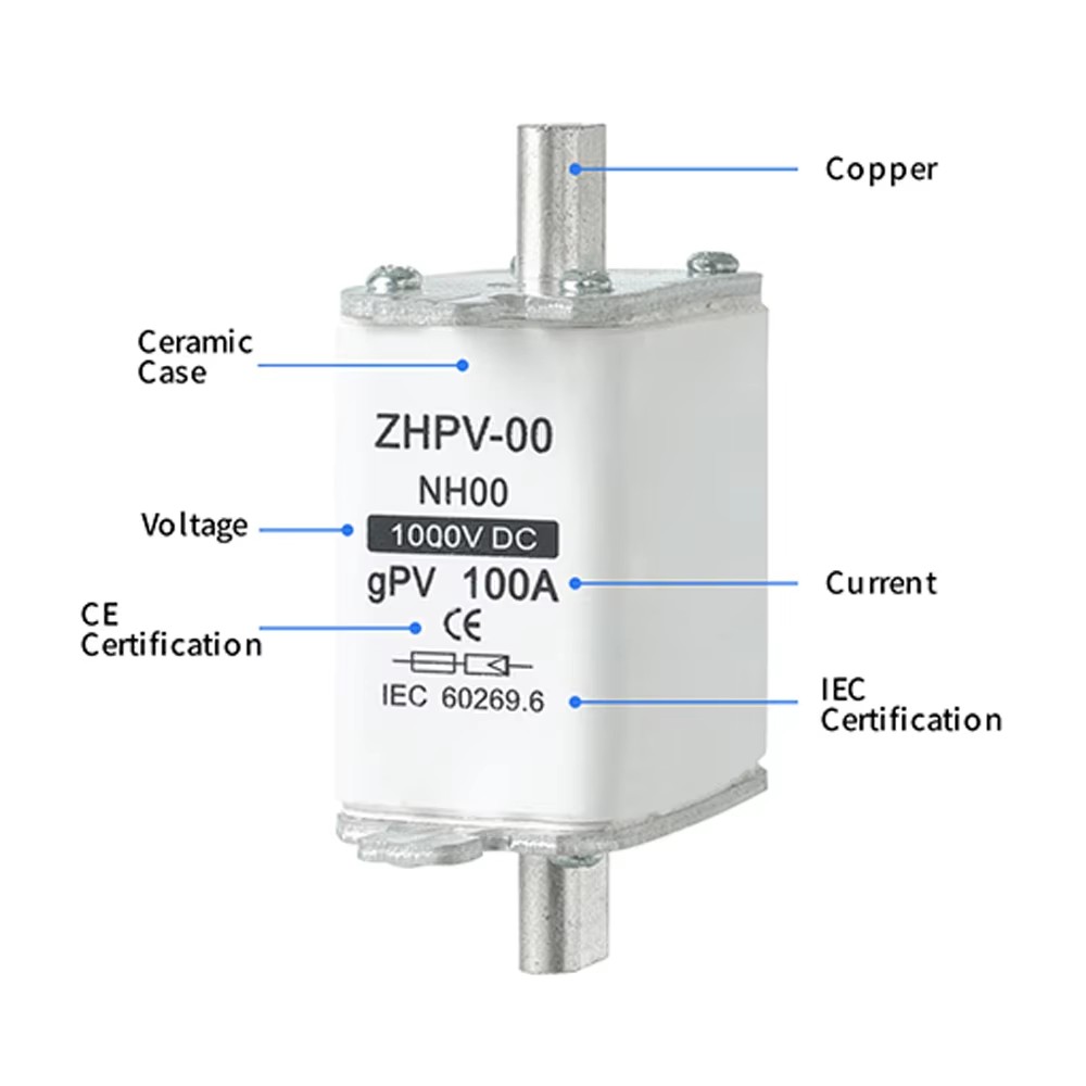 Système photovoltaïque NH00 DC 1000 V 32 ~ 100 A Fusible Des matériaux de haute qualité sont sélectionnés pour garantir des caractéristiques de fusible stables et fiables, une vitesse de réponse rapide et une sécurité élevée. D'apparence compacte, facile à installer, largement utilisé dans divers systèmes tels que les boîtiers de combinaison photovoltaïques, les onduleurs et les armoires de distribution CC. Le fusible du système photovoltaïque NH00 DC 1 000 V 32 ~ 100 A a passé plusieurs certifications internationales et est conforme aux normes CEI, ce qui en fait un choix idéal pour garantir le fonctionnement sûr des systèmes de centrales électriques.