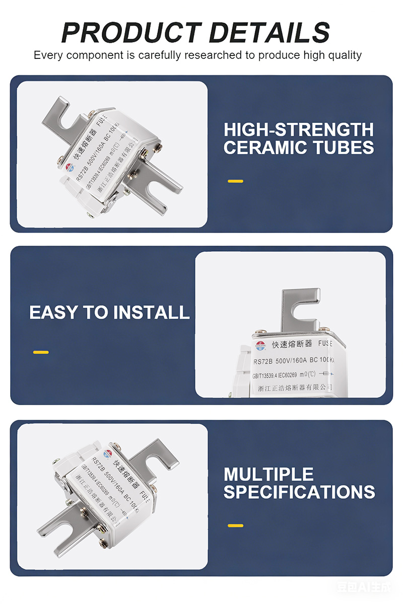 Ce produit convient aux applications telles que les systèmes électriques, les armoires de distribution, les transformateurs, etc., garantissant un fonctionnement sûr des circuits. Les fusibles RS72B 500 V 160 A BC 100 KA ont des caractéristiques de réponse rapide et peuvent rapidement couper le courant en cas de défaut, protégeant ainsi l'équipement en aval. Sa tension nominale est de 500 V et son courant nominal est de 160 A, ce qui répond aux normes internationales. Facile à installer et à entretenir, adapté à diverses applications industrielles. Les fusibles RS72B 500 V 160 A BC 100 KA ont été reconnus par de nombreux utilisateurs pour leurs performances stables et fiables, ce qui en fait un choix idéal pour garantir la sécurité des systèmes électriques.