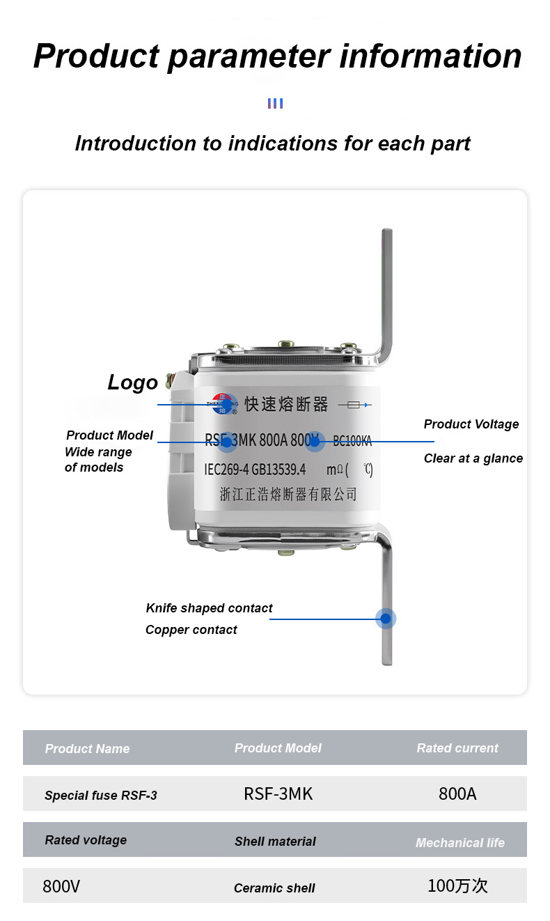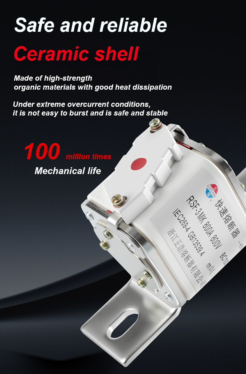a une tension nominale de 500 V et un courant nominal de 315 A, ce qui peut garantir efficacement la sécurité électrique, éviter les surcharges et les courts-circuits. Les liens de fusible RSF-3MK 800V-800A BC100KA