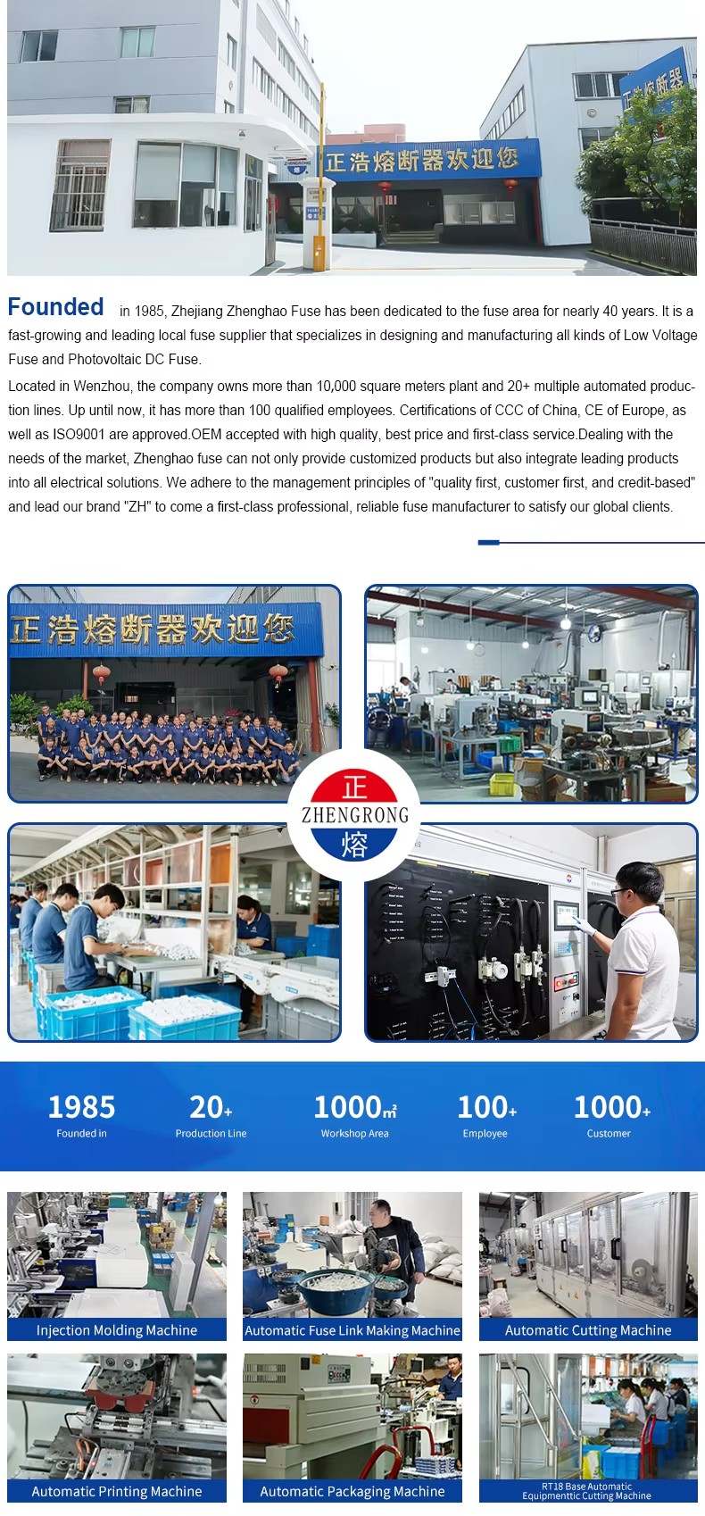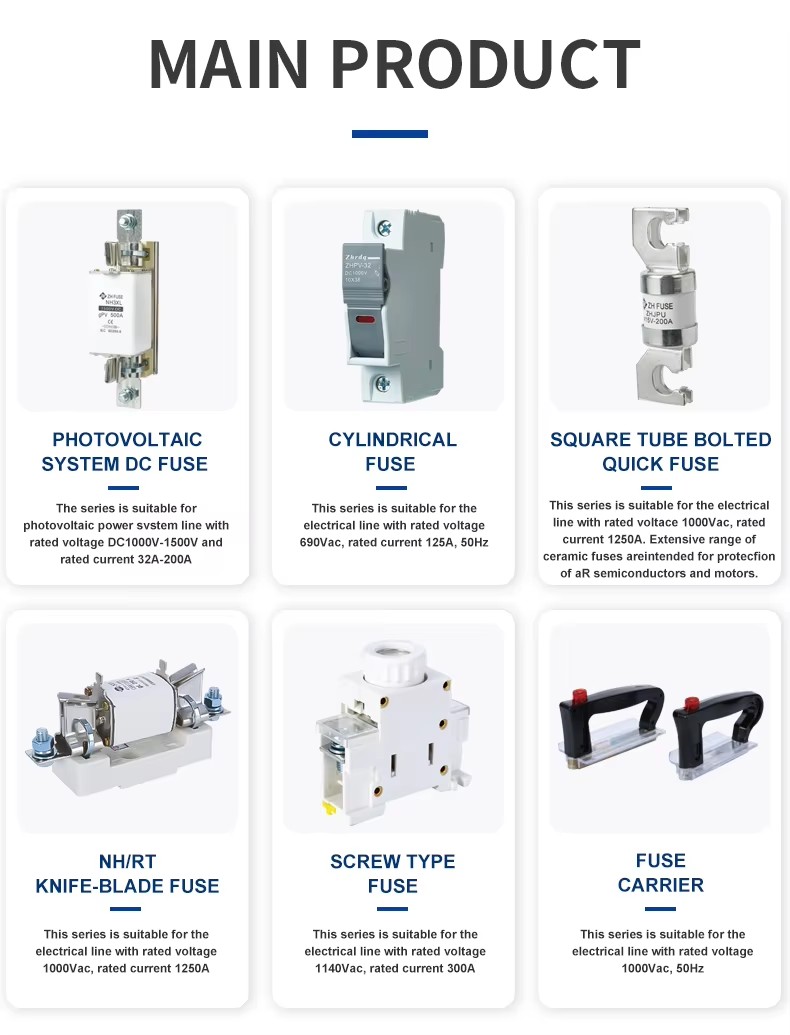 Les caractéristiques structurelles de la base de fusibles et de fusibles ZHPV-125 1000V DC et des liaisons de fusibles 22 × 58 mm de fond de fusible en céramique cylindrique dans le système photovoltaïque sont les suivantes. Cette série de fusibles se compose d'un lien de fusible et d'un titulaire de fusible. Le corps de fusibles transversal variable en feuille de cuivre pure (ou fil de cuivre, fil d'argent, feuille d'argent) est scellé dans un tube de fusible en céramique à haute résistance ou en tissu en verre époxy, rempli de sable de quartz de haute pureté traité chimiquement comme milieu d'extinction d'arc. Les deux côtés du noyau de fusible sont connectés de manière fiable à la plaque d'extrémité par soudage au comptant, formant une structure en forme de capuchon cylindrique. La base de fusibles CC ZHPV-125 1000V est faite de résine ou de coquille en plastique pressée avec un choc électrique, y compris un élément de fusible, qui est connecté en rivetant comme support pour la composante du corps de fusible de taille appropriée. Cette série de fusibles présente les avantages d'un petit volume, d'une installation facile, d'une utilisation sûre et d'une belle apparence.